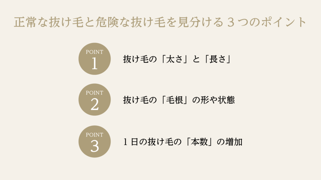 特に注目すべきは、抜け毛の「太さと長さ」、毛根の形や状態、そして1日の抜け毛の本数です。