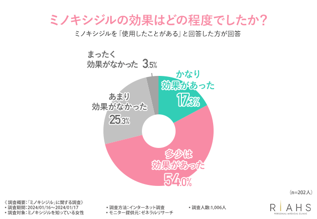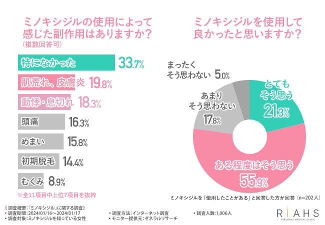 リアスクリニックでは、ミノキシジルを知っている女性1,006名を対象に、実際の使用感や満足度についてアンケート調査を実施しました(調査期間:2024年1月16日〜17日、インターネット調査)。