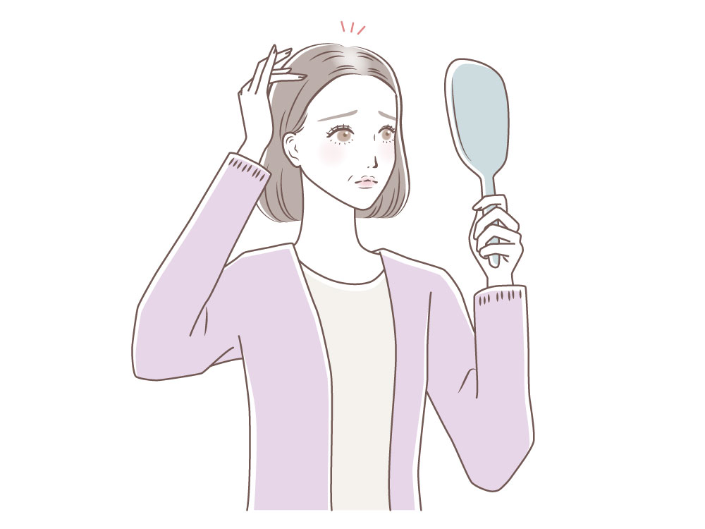 さらに、更年期の女性は、女性ホルモン(エストロゲン)の減少により、テストステロンなどの男性ホルモンの影響を相対的に受けやすくなります。このホルモンバランスの変化が、薄毛の進行に関与することがあります。このようなホルモンバランスの変化に対する対策として、専門の医療機関でのホルモン補充療法や、女性ホルモンのバランスを整えるサプリメントの使用などで症状を穏やかにできる可能性があります。
