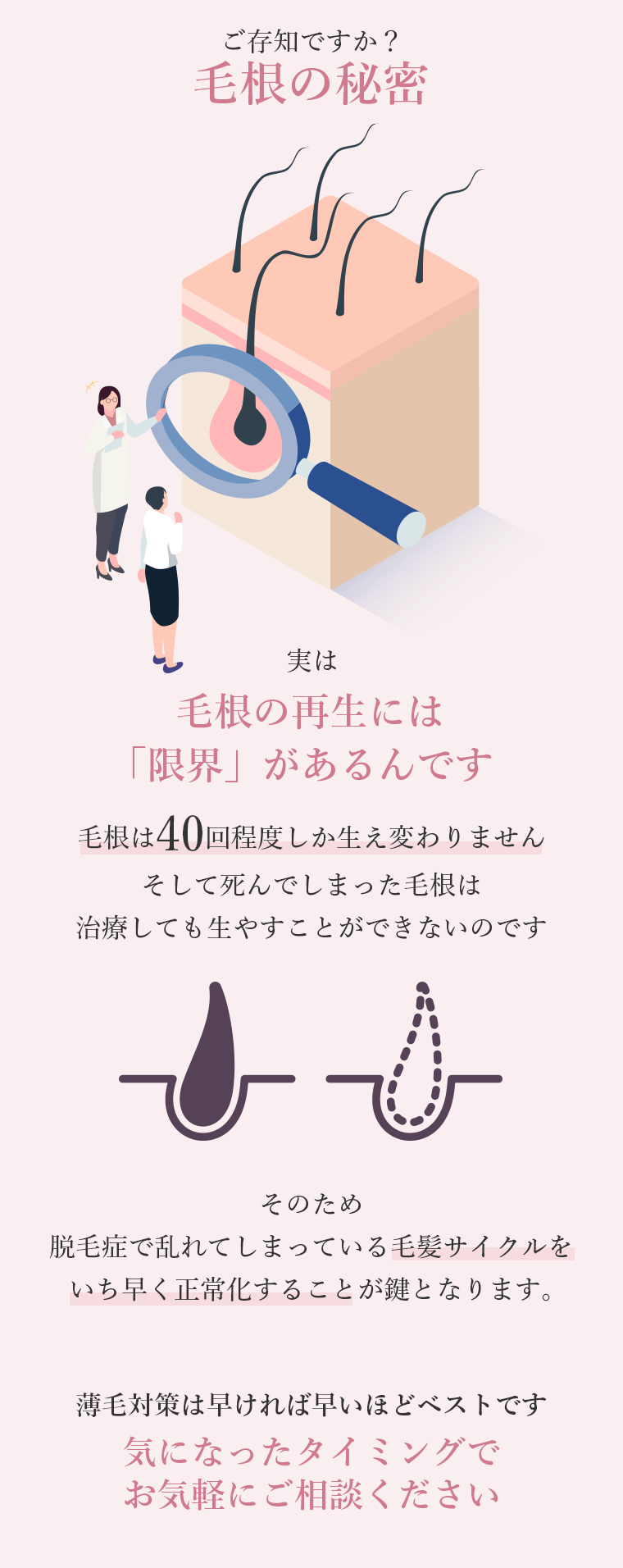 『まだ大丈夫かも…』『ホームケアでまだ頑張りたい』まずは無料診断してから考えるという手があります 無料診断の予約をとる カウンセリング/初診料・再診料/毛髪診断士による頭皮診断/毎月の血液検査 0円 もちろんその場で契約する必要はありませんセカンドオピニオンにもご利用ください