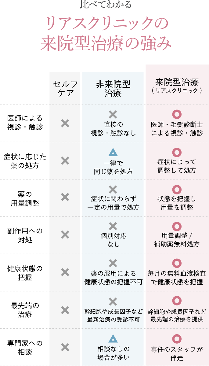 『いきなり病院にかかるのはハードルが高い…』まずは無料診断してから考えるという手があります 無料診断の予約をとる カウンセリング/初診料・再診料/毛髪診断士による頭皮診断/毎月の血液検査 0円 もちろんその場で契約する必要はありませんセカンドオピニオンにもご利用ください